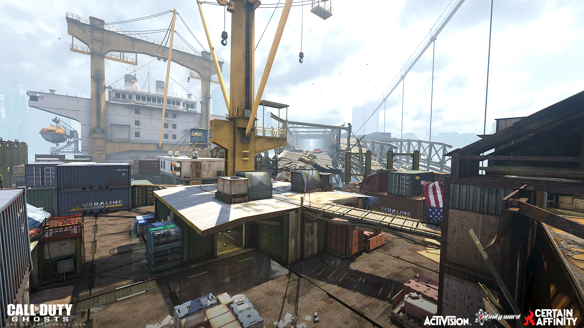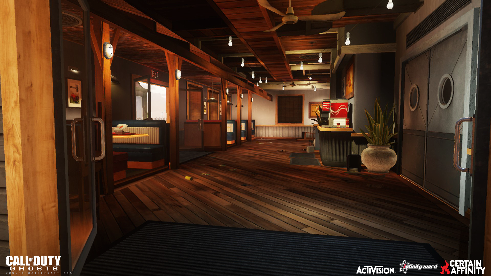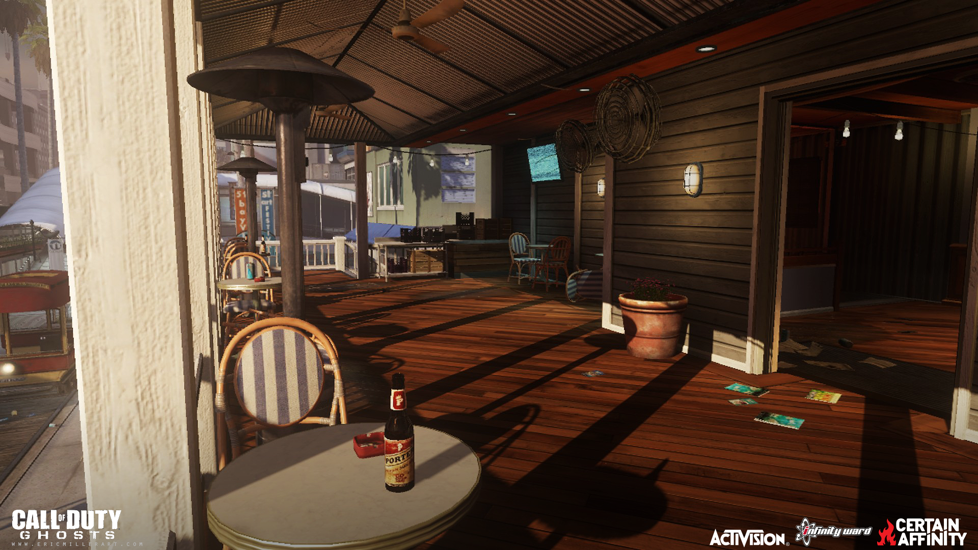 My role on Call of Duty: Ghosts was as an Environment Artist on 4 multiplayer maps. The maps I worked on were Bayview, Collision, Containment, and I also helped out on Behemoth (initial level art). My main work was world building, scene composition and set dressing, prop and structure creation (with bsp and patches), texture adjustments, some vista background work (outside of playspace the arena amphitheater and boardwalk), as well as polish work and bug fixing. This was a collaborative effort with several other artists and team members sharing responsibilities on each map. The production software I used were Activisions proprietary engine Radiant, Maya, and Photoshop.